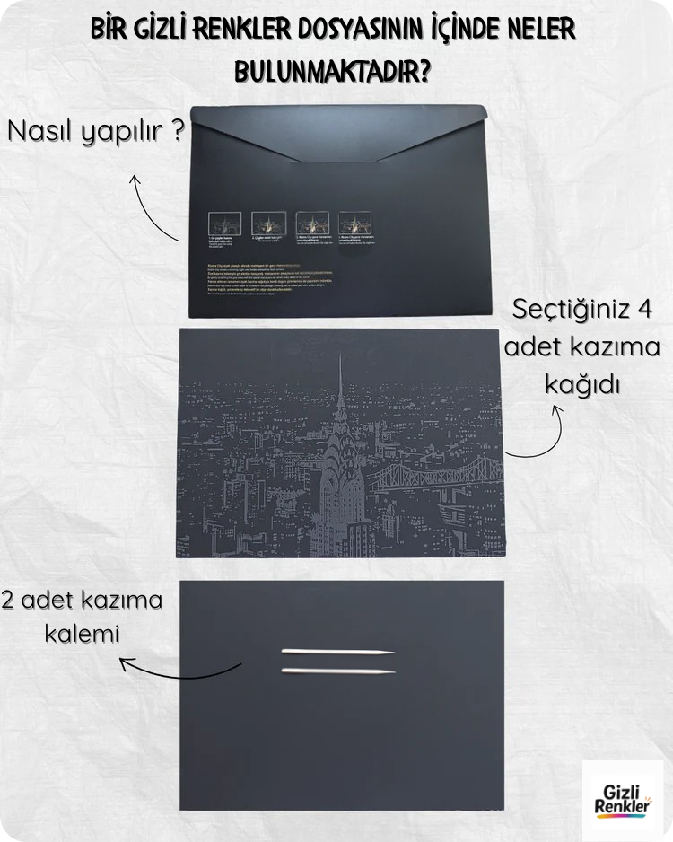 Gizli Renkler kazıma sanatı seti, hem çocuklar hem de yetişkinler için mükemmel bir yaratıcılık aracıdır. Bu ürün, dağınıklık yaratmadan keyifli ve rahatlatıcı bir sanat deneyimi sunar. İster minik bir sanatçı olun, ister günlük hayatın stresinden uzaklaşmak isteyen bir yetişkin, bu set ile istediğiniz zaman ve yerde kendi benzersiz sanat eserinizi ortaya çıkarabilirsiniz.